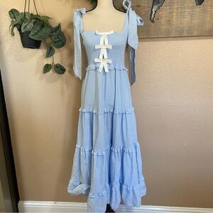 NWOT Sister Jane Kansas Blue Striped Tiered Smocked Tie-Strap Bow Midi Dress