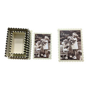 Celebrate that special bond between sisters. The picture shows 2 young sisters playing with their dolls and a baby carriage. The scene is highlighted with silver glitter in the girls hair and on their shoes. Sisters is at the top of the box. Accented with silver glitter Scalloped edges on the top part of the boxes and black white stripes on the sides. Inside dimensions: Larger box 4.75x3.5 inches. Smaller box: 3.5x2.15 inches. Made of coated rigid paper covered cardboard.