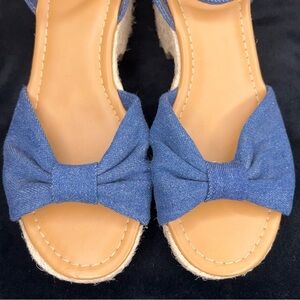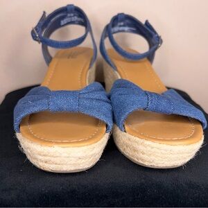 NWOT Size 7 Women’s Retro Heeled Sandals Denim Blue Open Toe Bow Ankle Strap