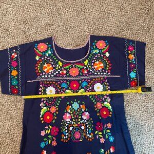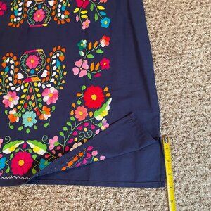 Brand new. Never worn. Size Large navy embroidered Mexican dress. Beautiful floral embroidery on dark navy background. Crew neck with pink stitching on hemline, 4-inch side slits and gorgeous flowers and other embroidery throughout.