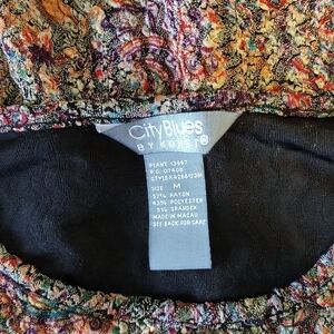 Size Medium colorful unique textured floral Paisley stretch knit blend fabric with long sleeves and a rounded neck line. This fabric type hangs on the body in a complimenting way