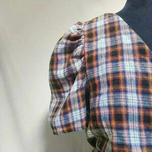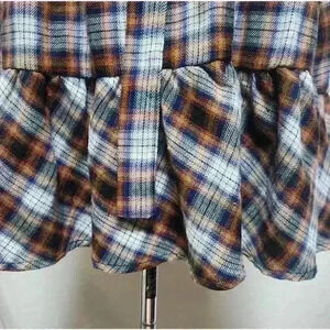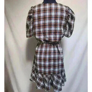 The little dress gives off real cottage core vibes with its 6 1/2" hem ruffle, gathered mutton sleeves, and beautiful plaid fabric.