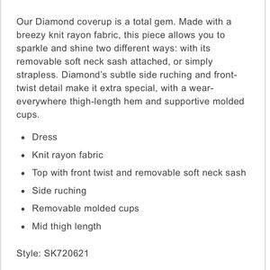 Our Diamond coverup is a total gem. Made with a breezy knit rayon fabric, this piece allows you to sparkle and shine two different ways: with its removable soft neck sash attached, or simply strapless. Diamond’s front cut-out detail makes it extra special, with a wear-everywhere thigh-length hem and supportive molded cups.