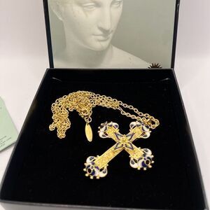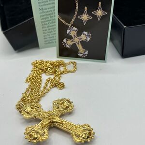 This set is beautiful and NWOT. The boxes are in old condition and I will send new boxes plus the original boxes for safe keeping. The cross is reversible and is 2 1/2” x 2”, the chain is 31” long. The earrings are clip and they are 3/4 x 3/4”.