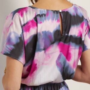 Elastic waist dress is comfort in a mood lifting print. Side seam pockets, drop shoulders, short sleeves and button keyhole at back. Satiny feel.