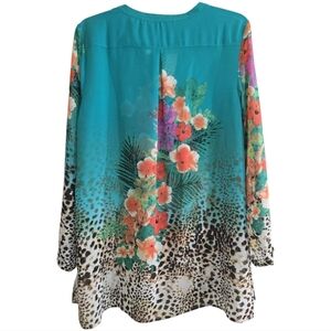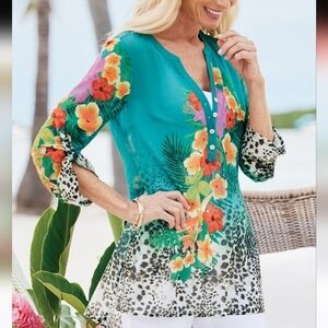NWOT Soft Surroundings Sheer Tropical Top Popover Hibiscus Floral Print Large