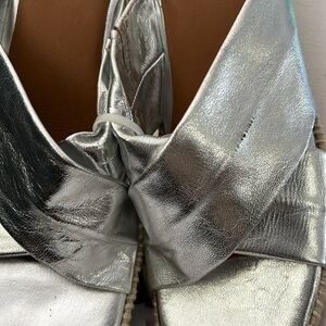 NWOT Softwalk Find Comfort Within, jute wedge, open toe, silver criss cross. Women’s size 9. No box. Please note photos showing the small black line on top left shoe, and the missing letters on sole of right shoe. Please review all photos. The jute on the heels can look unfinished in spots.