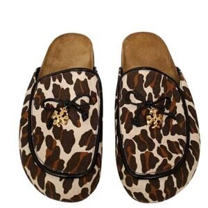 Keywords: Tory Burch slides, leopard print loafers, slip-on mules, animal print shoes, designer slides, cork footbed mules, chic casual footwear, trendy loafers, Y2K fashion, luxe comfort shoes.