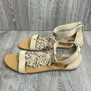NWOT Sole Society Koa Fringe Leather T-Strap Ankle Strap Flat Sandal Caramel 8.5