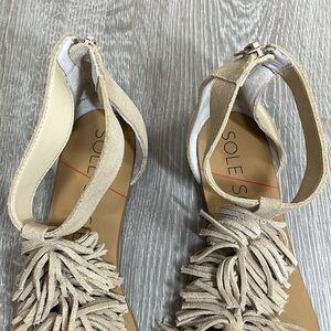 NWOT Sole Society Koa Fringe Suede Leather T-Strap Ankle Strap Flat Sandal in size 8.5M. Stock photo included in listing. Caramel color, leather upper, manmade lining and sole, t-strap with thong, back zipper closure. Please see photos for details. Item may show difference in color based upon photography and perception. Photos are part of the description, as everyone’s level of condition may vary. From smoke free and pet free home. All packages are shipped the same or next business day.