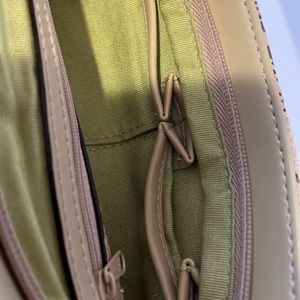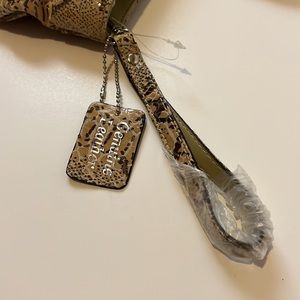 This clutch is a stylish way to carry your essentials. Snakeskin with a large metal accented closure. Genuine leather. Removable wrist strap. Zip close. Interior slip and zip pockets. Approximate size: 11” wide, 5” high, 1” deep. New without tags. Smoke-free closet. Always willing to consider reasonable offers!