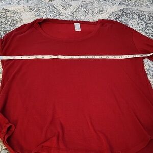 Elevate your wardrobe with this trendy red long sleeve thumbhole top. It is tunic length with tulip hem, slightly longer in the back for full bum coverage. It is poly/spandex blend for ease of movement; it is not form fitting. It is quite forgiving of any of our unwanted bumps or bulges. Be on trend and comfortable at the same time. Non-smoking home.