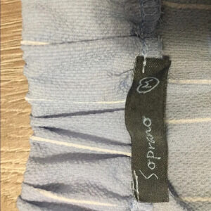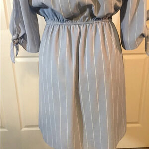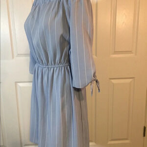 NWOT Soprano off the Shoulder dress in size M. Light blue & white stripes, 3/4 length sleeves with ties and elastic waist. Dress is machine washable polyester/spandex with polyester lining. Perfect condition, has not been worn. From smoke free and pet free home.