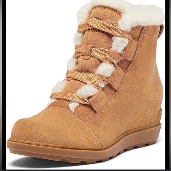 NWOT Sorel Evie II Cozy bootie, tan with off white Sherpa. Wedge, women’s 10
