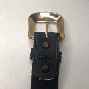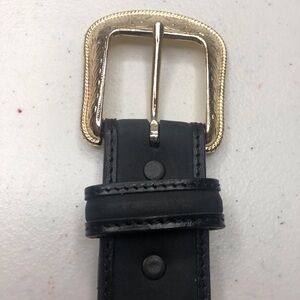 This stylish Southwestern mens belt features a striking black design with intricate gold and brown accents. Perfect for adding a touch of style to any outfit. Brand new without tag. Belt measures tip to tip 42.5 inches. Belts width is 1-3/4 inches.