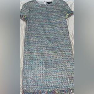 St. John Collection cocktail dress in party confetti-knit tweed with fringed trim. Crew neckline. Short sleeves. Sheath silhouette. Hem hits about at the knee. Back zip. Rayon/polyester/cotton/metallic polyester. Trim, nylon/cotton/rayon/acetate/polyester. Lining, silk/spandex.