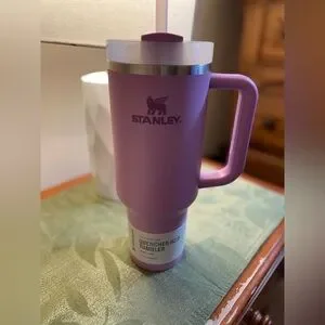 NWOT Stanley Cup, Durable insulated tumbler for hot or cold drinks. Easy-grip handle for comfortable carrying. Spill-resistant lid with straw access. Sleek purple finish and stainless trim.