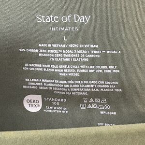 The NWOT State of Day L 2-Piece Fluid-Knit Pajama Set in organic green is a stylish and comfortable addition to any woman's sleepwear collection. Made from a soft blend of spandex and modal, this robe and tank set features a solid green color with a tie closure for a personalized fit. Perfect for all seasons, this pajama set is machine washable for easy care and maintenance. With a size L and a regular fit, this set is designed for a relaxed and cozy sleeping experience.
