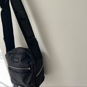-in brand new condition -black nylon crossbody purse -has lots of exterior pockets and zippers and an interior zipper pocket -It also comes with a detachable flap that can go on the front (pictured in the last photo)