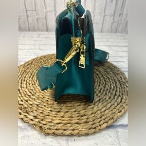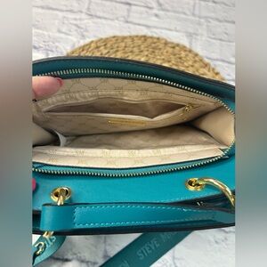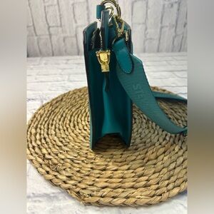 Chic Steve Madden teal crossbody bag. Features bold branding and adjustable strap. There are three different compartments on the inside. Ideal for everyday use.
