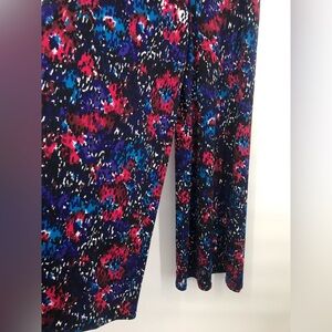 Stretchy Colorful Palazzo Pants. Abstract Print with pink, burgundy, blue, purple, black and white. Great stretch! These have to be so comfortable! If only I could fit in them myself 🥴 I would so be keeping them! Wide waistband adds to the comfort. Layflat Measurements: waist 14.5”, hips 21”, inseam 30.5”, leg openings are 23” wide! Measurement taken without using any stretch. Size Medium