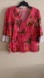 This stylish blouse features a vibrant floral design on a red striped background, complemented by elegant lace sleeves. Perfect for any occasion.