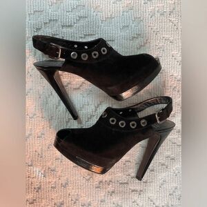NWOT Stuart Weitzman Black Suede Slingback peep-toe grommet heels size 9.5