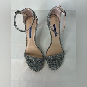 NWOT Stuart Weitzman stiletto heels. No stains, rips or bad odor. Shimmery silver color. Open to and close heel. straps around ankle. Leather upper materail. Great to style them with formal gown wear. Perfect for Cinderella weddings, proms, holidays and special events. Please see pictures for more details.