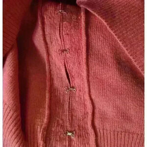 Classically-styled, this cardigan closes with a series of hook and eye closures (see photo)- it could be worn open if desired.
