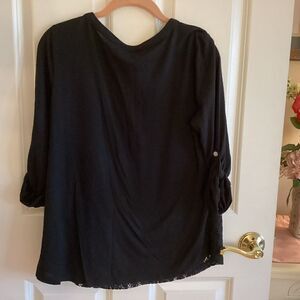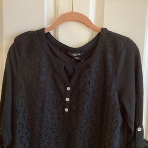 New without tags. Style & Co. Brand women’s top features a solid black back and front under layer. Then the front is over layer with a black lace layer, so no see-through. Sleeves can be worn long or rolled up to 3/4 length with a button tab. Polyester and rayon blend has a slub texture to it while lace is all polyester. Showing hoots of front and back sides along with fiber contents and care information. Center back length of 26 1/2”.