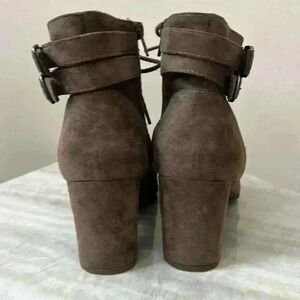 Taupe Suede Madden Girl Ankle boots with hell and zipper on the inside.