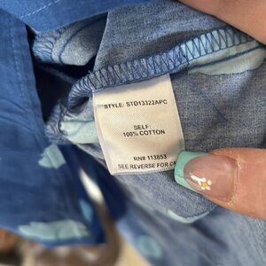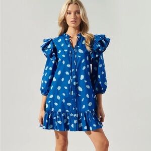 Dripping in blues! This playful, imperfect blue dot print is a fun addition to any wardrobe. Sweet details make this dress like its ruffle trim split neckline and ruffle layered capped shoulders to frame long balloon sleeves.It maintains an A line silhouette with a drop ruffle waist. Functional buttons line the front of the dress. Wear it with blue or white strappy heels and gold accessories to complement the look!