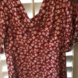 Lovely, light summer red dress with white flowers. Top gathers under bust with bell short sleeves.