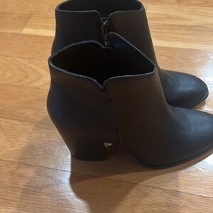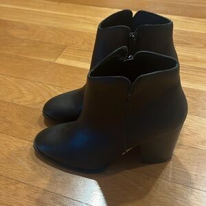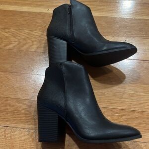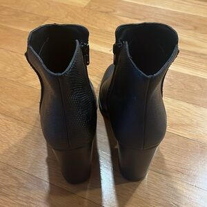 NWOT Sun +stone Gracey black faux leather block heel ankle boots size 9 .