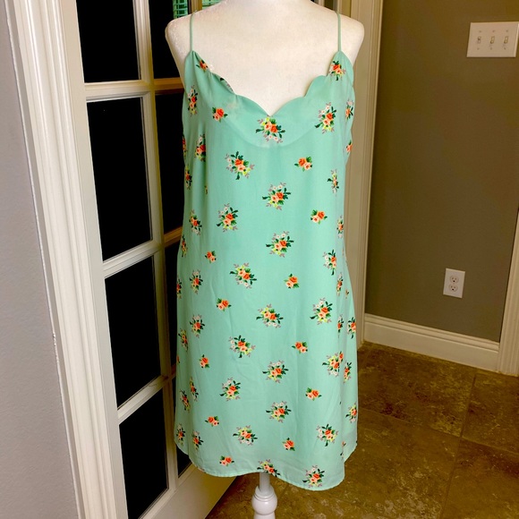 Never worn! 👗 This petty little dress is scalloped up front, zips in the back with adjustable spaghetti straps. Double lined.