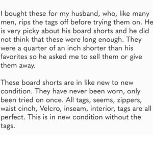 These shorts are in excellent condition. He tried them on and then threw them in the drawer after ripping off the tags and then never wore them.