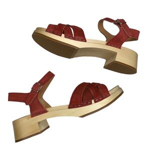 A classic pair of wood sandals from Swedish Hasbeens. They have red suede straps and a chunky heel. The perfect shoe for summer dresses! Euro size 38 which is a 7