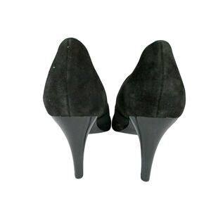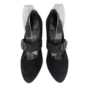 From Tahari,in black genuine suede leather with a black patent leather heel! These heels, pumps, feature a grosgrain ribbon strap, beaded with a floral detail! Gorgeous! 3.5" heel, Size 8M, though new and stored, they actually have a *Condition Note: in 2 tiny places there are nicks- pre-peel-, almost impossible to see, can't see when on! Very very minor, and they're Otherwise: ***NEW Without Tags, and Guaranteed Superb by Lily @HauteClub!*