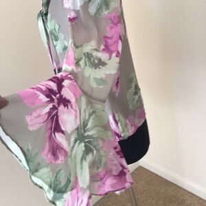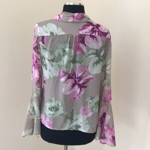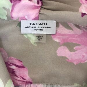 New! Tahari size PS beige with pink floral Button Down Blouse With Bell sleeves and neck tie. Beautiful for casual or work.