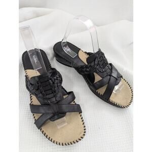From Thomas McAn, in black genuine leather, these wedges, sandals feature a woven front, multi and braided straps, and hand stitching! Slip-on, Size 10 Wide, 1.5" wedge! Brand New! *Measurements always available on request!* ***NEW Without Tags, and Guaranteed Perfect by Lily @nocd, @nocdLily!**