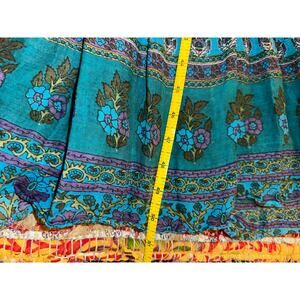 THE COLORS ON THIS DRESS ARE ABSOLUTELY INCREDIBLE!! NEVER WORN HIPPIE BOHO INDIAN PRINT DRESS, HAS BUILT IN LINER IN SOLID TURQUOISE. 100% COTTON GAUZE. SIZE SMALL, RUNS BIG, MEASUREMENTS IN PHOTOS. TASSELS WITH BRASS BELLS. ONE TASSEL BECAME DETACHED AS I WAS PHOTOGRAPHING AND JUST NEEDS RESTITCHING (PLEASE SEE CLOSEUP). VINTAGE BELT IS NOT INCLUDED BUT IS AVAILABLE SEPARATELY.