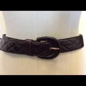 100% leather quilted belt. I would describe the color as eggplant. Belt has never been used. New, but has no tags.