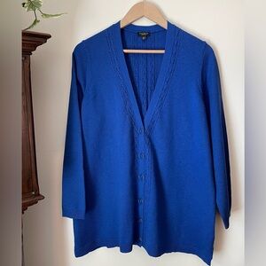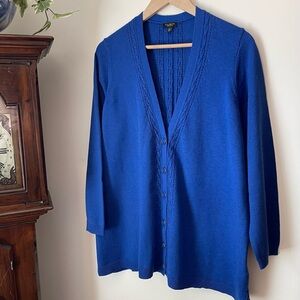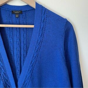 NWOT This classic Talbots cardigan sweater was stylishly updated with feminine pointelle details. It showcases a deep V-neck, enameled buttons, long sleeves, and a vibrant blue hue. The soft knit fabric is a comfortable mid-weight. Its tunic-length cut hits just below the hip and provides a versatile style, perfect for any occasion.