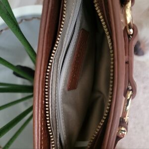 Brand new camel brown crossbody bag. Never used! 100% leather exterior. Purse has an interior zip pocket and features a gold buckle across the front. Gold and brown chain strap featuring brown leather at the shoulder.