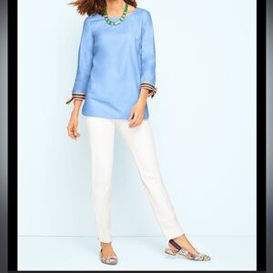Our favorite popover silhouette is effortlessly stylish, updated with colorful and feminine cuff ties. With a flattering neckline and an elongating tunic length, this top is polished and highly versatile. Wear with our Chatham Ankle pant and simple sandals for a casual-chic look.