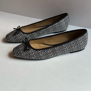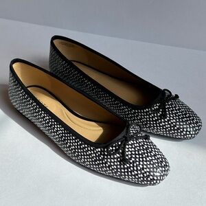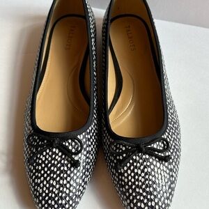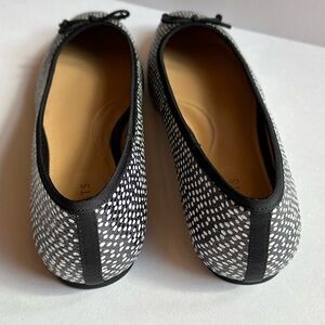 NWOT Talbots ballet flats that feature a navy and white polka dot pattern, offering a stylish and modern look. The rounded toe and flat sole ensure comfort, while the decorative bow adds a touch of elegance. Perfect for both casual and business casual settings, these shoes are a versatile addition to any wardrobe. Sz 10.5