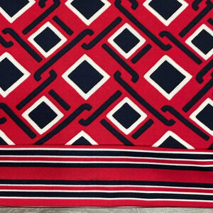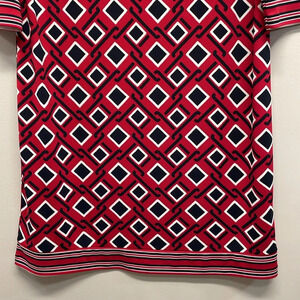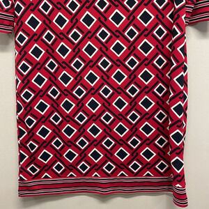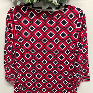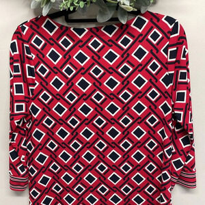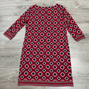 NWOT Talbots Petites 3/4 Sleeve Stretch Shift Dress in size LP. Excellent new condition. Pullover style, red, black and white geometric print with striped detail at hem and cuffs. Please see photos for approximate measurements and details. Item may show difference in color based upon photography and perception. Photos are part of the description, as everyone’s level of condition may vary. From smoke free and pet free home. All packages are shipped the same or next business day.
