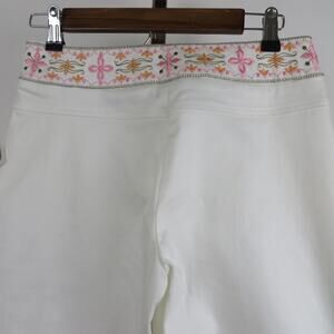 Adorable white pants with a colorful floral waistband. Perfect for casual or dressy occasions. Comfortable and stylish. New without tags, never worn. Tag shown in photo was removed and the pants were washed with intention to wear them but were never worn.