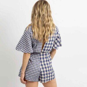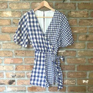 NWOT Talulah Wrap Gingham Romper Shorts Blue V Neck Short Sleeve Boho Sz Small