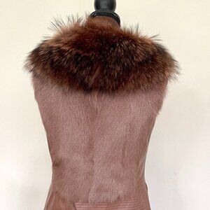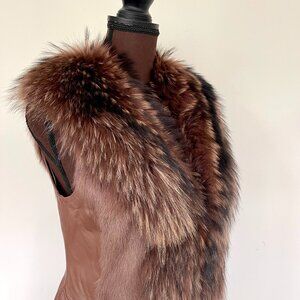 NWOT Tan Brown Leather Vest Real Fox Fur L size